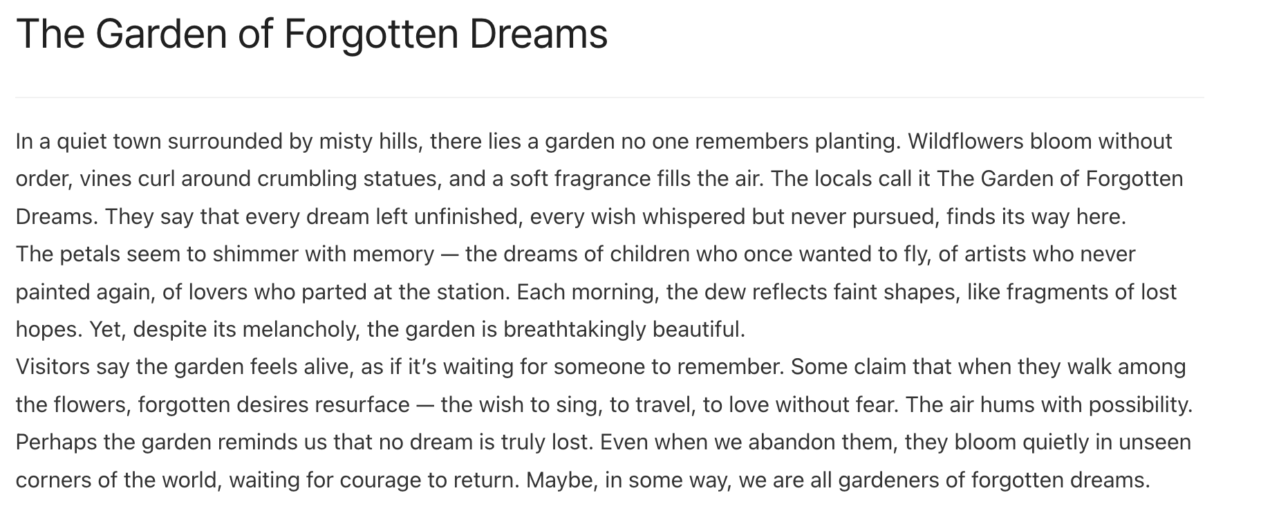 In a quiet town surrounded by misty hills, there lies a garden no one remembers planting. Wildflowers bloom without order, vines curl around crumbling statues, and a soft fragrance fills the air. The locals call it The Garden of Forgotten Dreams. They say that every dream left unfinished, every wish whispered but never pursued, finds its way here.The petals seem to shimmer with memory — the drea..